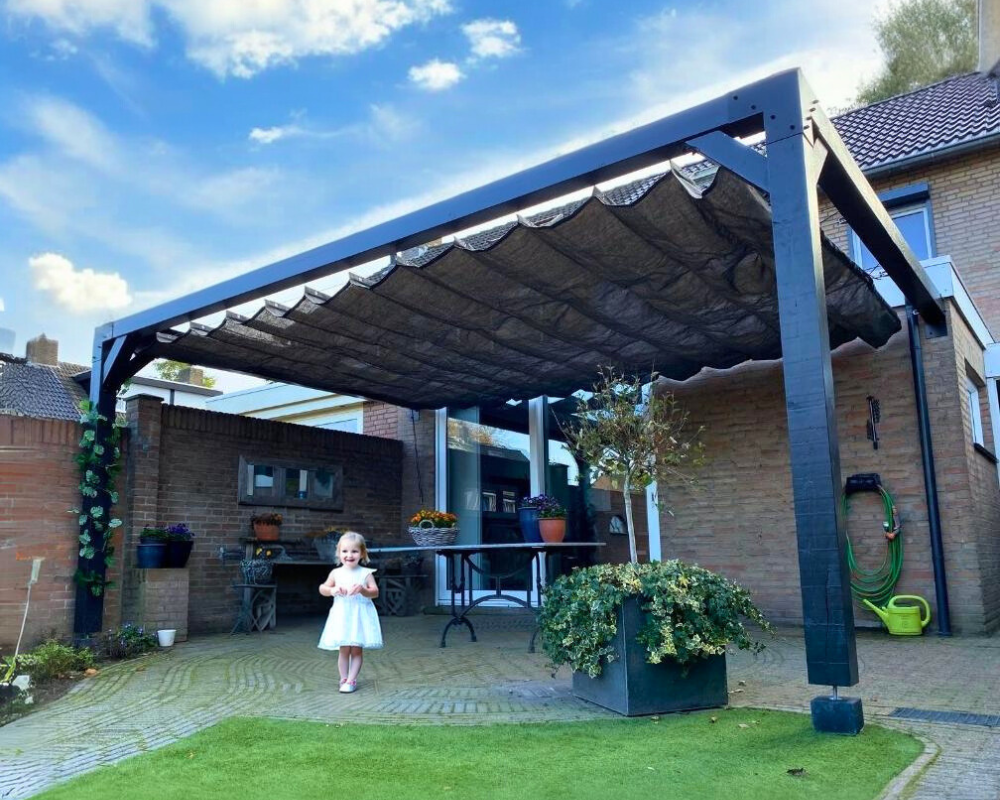 Echt een aanrader, de muur pergola van Rijpex met harmonicadoek! Makkelijk te monteren en het ziet er fantastisch uit in onze tuin.